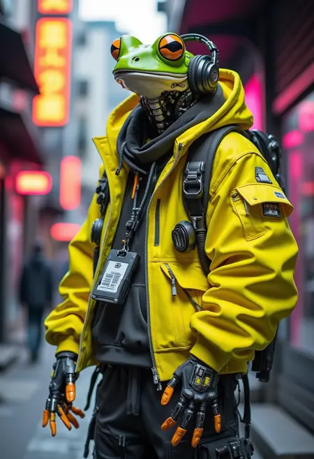 2. 사이버펑크 패션 스타일, 인간형 개구리, 기술적 디테일이 있는 밝은 노랑 후드티, 사이버네틱 팔다리, 네온 조명이 밝힌 도시 골목.