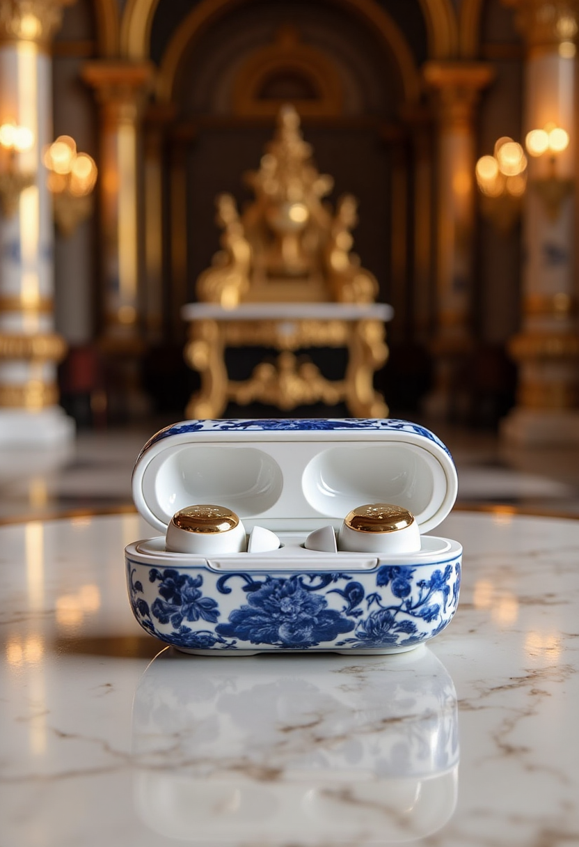 2. Blue and white porcelain pattern decoration, stylish wireless earbuds, with gold - plated parts, placed on a marble table in a noble hall.