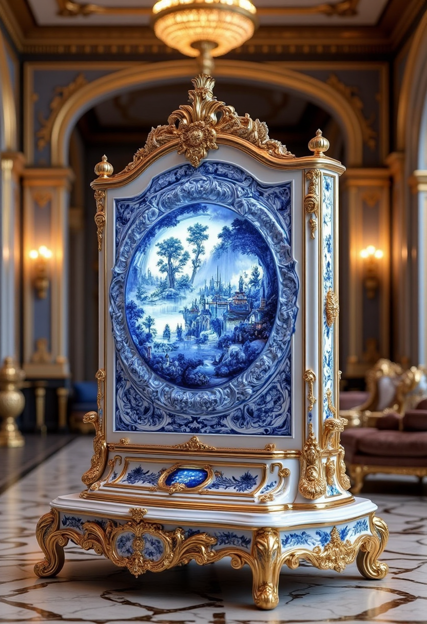 5. Blue and white porcelain pattern decoration, futuristic game console, gold - trimmed edges, in a grand and magnificent gaming room.