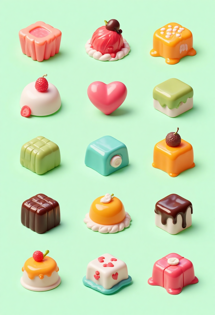 2. 可爱的糖果主题3D图标,光泽表面,形状多样如心形和方形,置于柔和的绿色底座上,部分带有巧克力滴落效果。