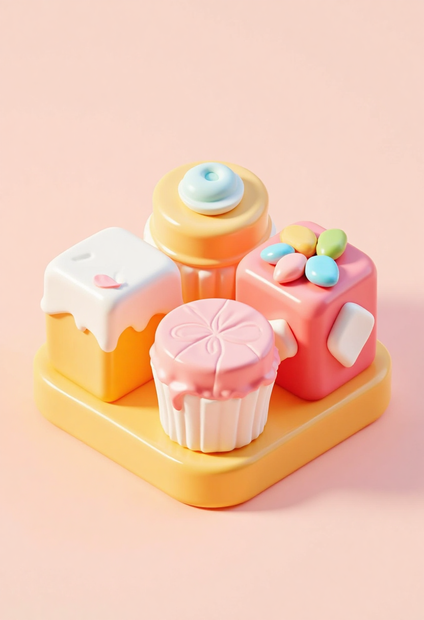 10. 可爱的糖果主题3D图标,糖果漆涂层,童话风格设计,置于红色底座上,点缀有迷你纸杯蛋糕顶饰。
