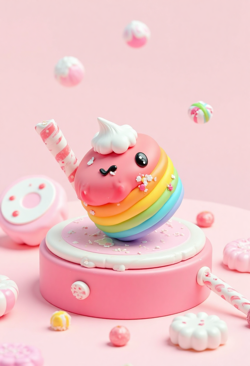 3. 可爱的糖果主题3D图标,哑光质感,明亮的彩虹色调,放置在粉色平台上,点缀有糖果棒造型细节。