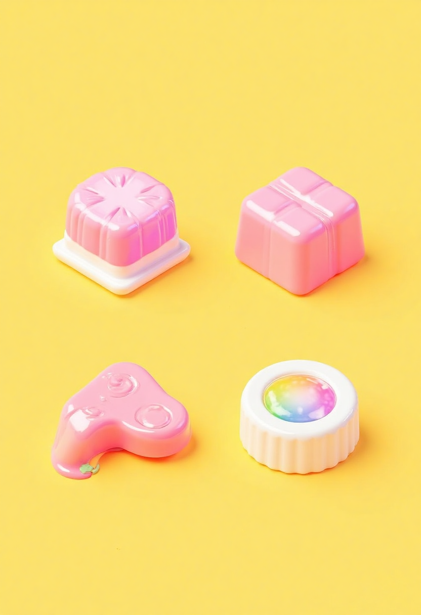 5. 可爱的糖果主题3D图标,透明元素,经典圆形和方形造型,放置在黄色舞台上,内部为果冻状填充物。