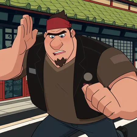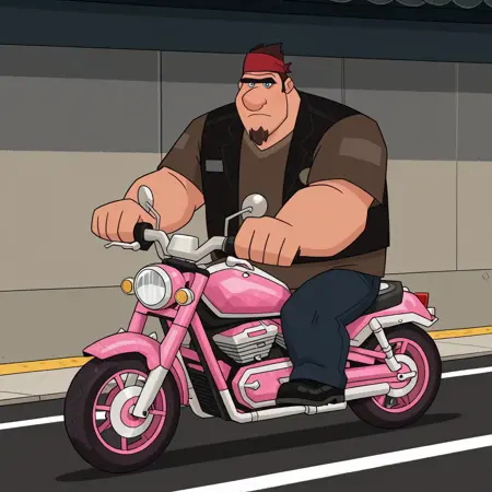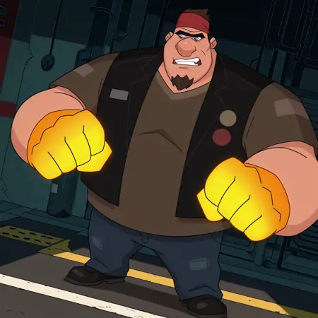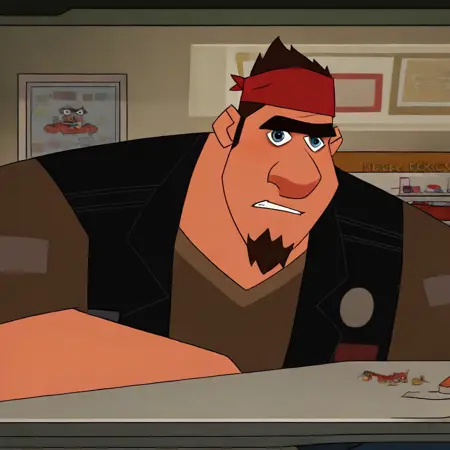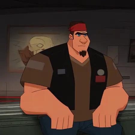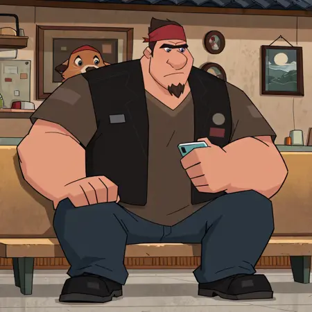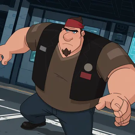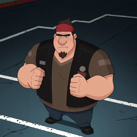 FelonyCarl, 남성, 성숙한 남성, 근육질 체형, 큰, 진한 갈색 머리카락, 빨간 헤드밴드, 진한 갈색 단일 brows, 밝은 파란 눈, 큰 코, 진한 갈색 고เท, 갈색 티셔츠, 검은 바이커 베스트, 진한 청바지, 검은 신발,