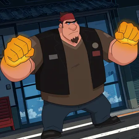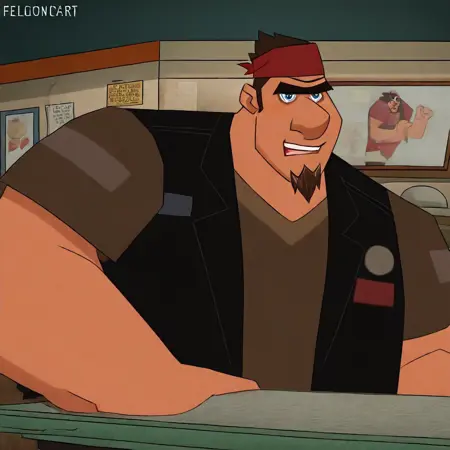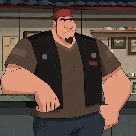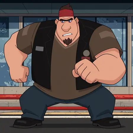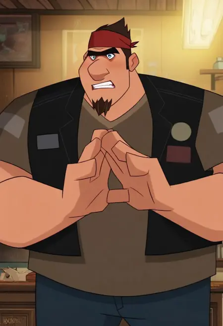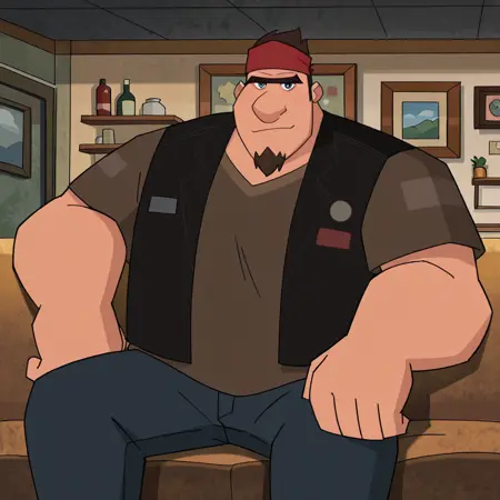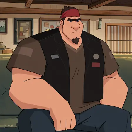 FelonyCarl、男性、成熟した男性、がっしりした体格、濃い茶色の髪、赤いヘアバンド、濃い茶色の眉間毛、薄い青い目、大きな鼻、濃い茶色のヒゲ、茶色のTシャツ、黒いバイカー用ベスト、濃い青のジーンズ、黒い靴、