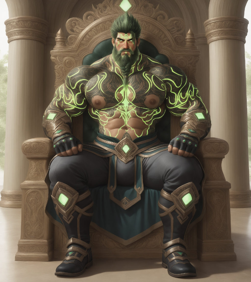例:「王座に座る」画像の顔はComfyUIでinpaintingされ、マスクは顔(耳と一部のひげ・髪)をカバーしていましたが、編み込みや背景は含んでいません。inpainting前の画像は2倍にアップスケールされており、サンプラーはdpmpp_2m+karras、ノイズ除去率は0.6でした。