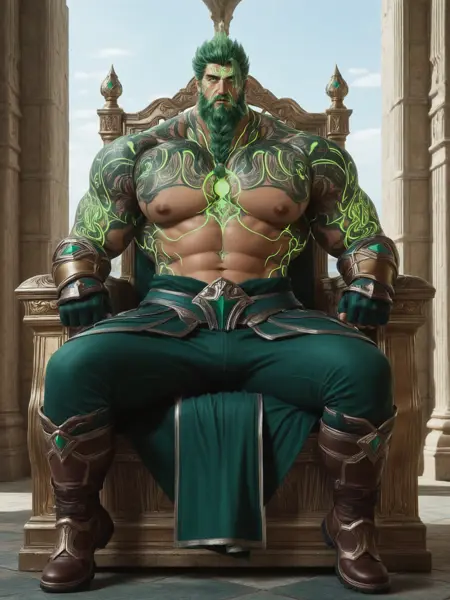 例:「王座に座る」画像の顔はComfyUIでinpaintingされ、マスクは顔(耳と一部のひげ・髪)をカバーしていましたが、編み込みや背景は含んでいません。inpainting前の画像は2倍にアップスケールされており、サンプラーはdpmpp_2m+karras、ノイズ除去率は0.6でした。