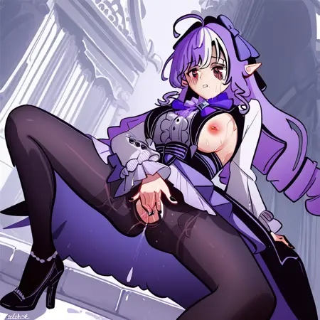 (ZZZ_Banshee, long hair, multicolored hair, streaked hair, white hair, purple hair, drill hair, red eyes, pointy ears, ahoge, bangs, black nails, dress, frills, long sleeves, purple bow, sideboob, clothing cutout, pantyhose, high heels),