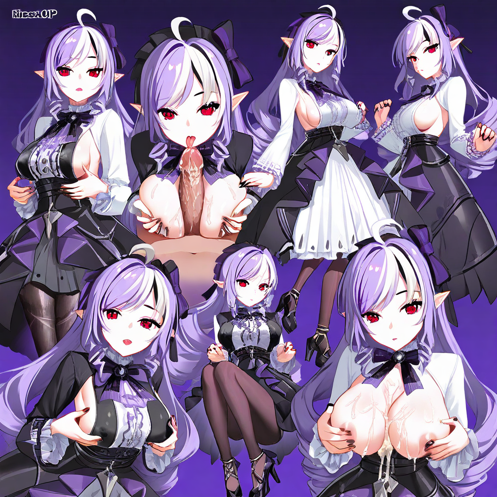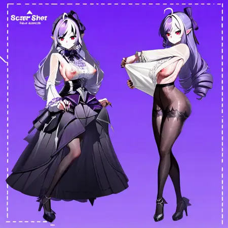 (ZZZ_Banshee, long hair, multicolored hair, streaked hair, white hair, purple hair, drill hair, red eyes, pointy ears, ahoge, bangs, black nails, dress, frills, long sleeves, purple bow, sideboob, clothing cutout, pantyhose, high heels),
