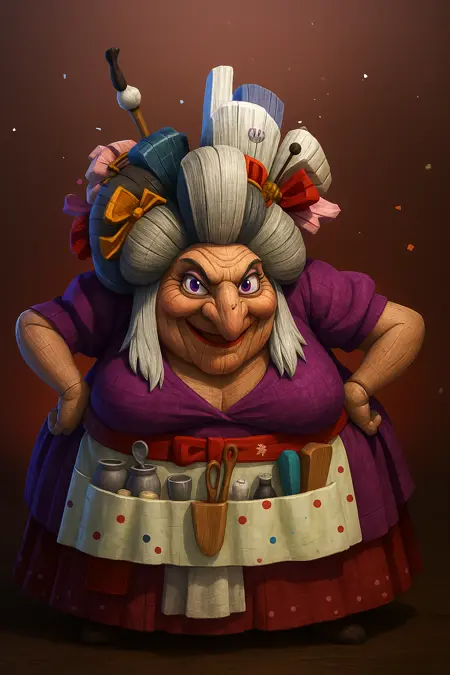ezma potts(木偶奇遇记),日式发型,丸子头,白发,长侧发,蓬松短袖,发饰,老妇人,年老,长鼻子,大鼻子,圆框眼镜,肥胖,肥胖,尖鼻子,尖下巴,黑眼睛,妆容,口红,红唇,围裙,紫色连衣裙,粉色蝴蝶结,发夹,大乳房,下垂乳房,背部蝴蝶结,紫色连衣裙,围裙