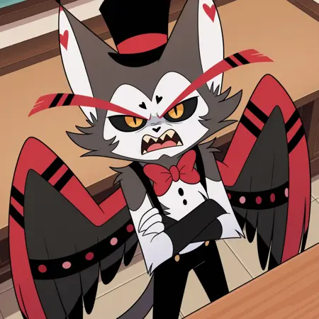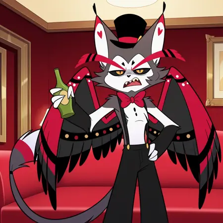 来自《地狱客栈》的Husk。这是应用户要求训练的模型,我使用了约80张1080p分辨率的图片进行训练,未包含任何同人插画。剧中很少出现展示他羽毛尾巴的镜头,因此不要期望尾巴能准确呈现。翅膀的颜色区域也几乎永远不会准确。其他所有部分都能完美还原。