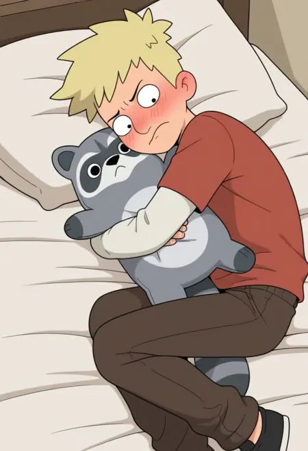 1boy,solo,male focus,Loganberry Bush,spiky hair,blonde hair,skinny,tall,red t shirt,white long sleeve,brown pants,black shoes,