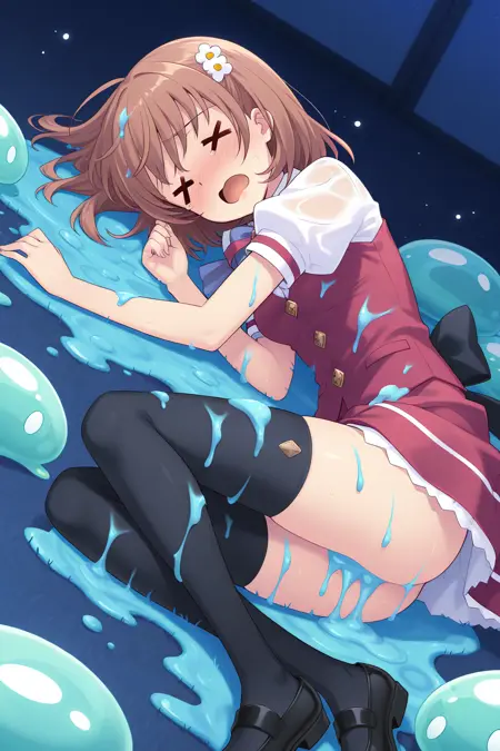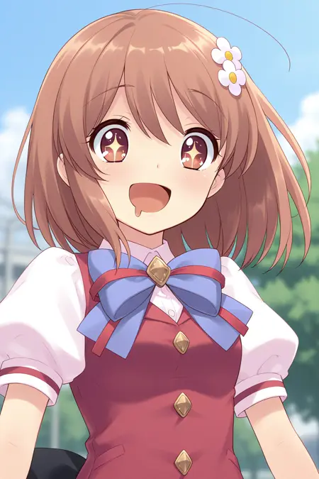 학교 복장, 빨간 조끼, 단추, 흰 셔츠, 분홍 셔츠, 파란 리본 넥타이, 목 리본, 빨간 리본, 부풀어 오른 짧은 소매, 스커트 세트, 검은 리본, 뒷 리본, 빨간 스커트, 흰색 선, 페티코트, 제타이 류오이키, 검은 허벅지 스타킹, 메리 제인, 검은 신발,
