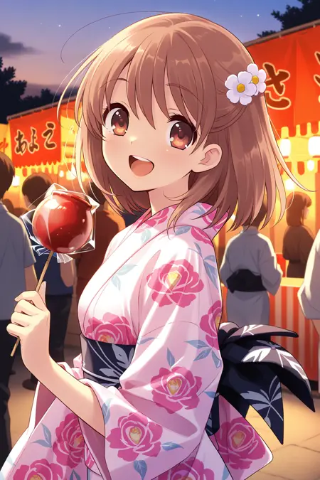 inaba yui, 갈색 눈, 갈색 머리, 중간 길이 머리, 한쪽 위로 올린 머리, 반쯤 올린 헤어스타일, 아호게, 머리에 꽃, 흰색 꽃,