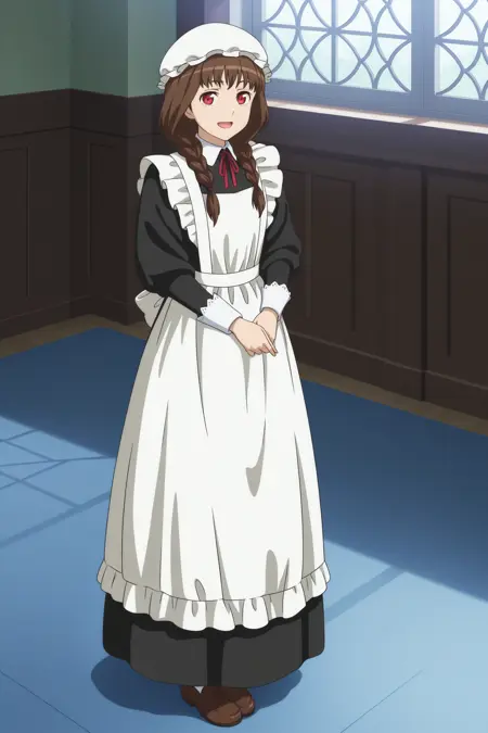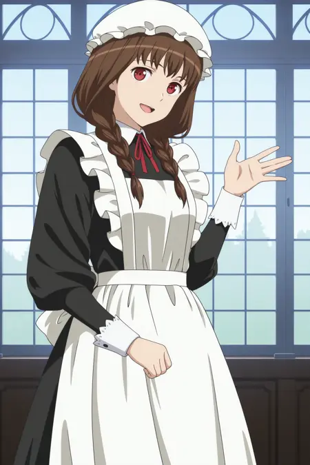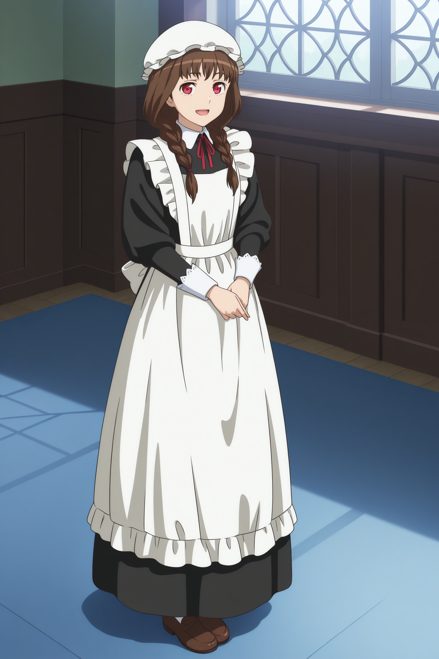 maid ane, long hair, brown hair, twin braids, hair tie, hair over shoulder, mob cap, wispy bangs, red eyes, maid, long sleeves, sleeve cuffs, black dress, long dress, maid apron, neck ribbon, red ribbon, back bow