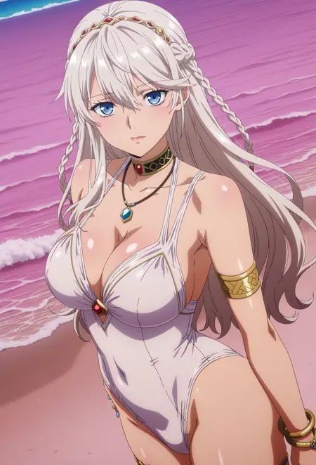 brgbkn_(granado_espada), 1girl, solo, 성숙한 여성, 흰 머리카락, 긴 머리카락, 땋은 머리, 파란 눈, 큰 가슴, 큰 엉덩이, 가슴 틈, 보석, 어깨 노출, 수영복, 체인 목걸이, 목걸이, 팔찌, 마이크로 수영복, 원피스 수영복, 하이레그, 배꼽 가린, 팔찌, 흰색 원피스 수영복, 캐주얼 원피스 수영복, 흰색 네일, 네일 폴리시, 허벅지 스트랩, 허벅지 체인, 금 허벅지 체인, 샌들, 하이힐 샌들,