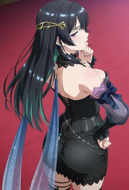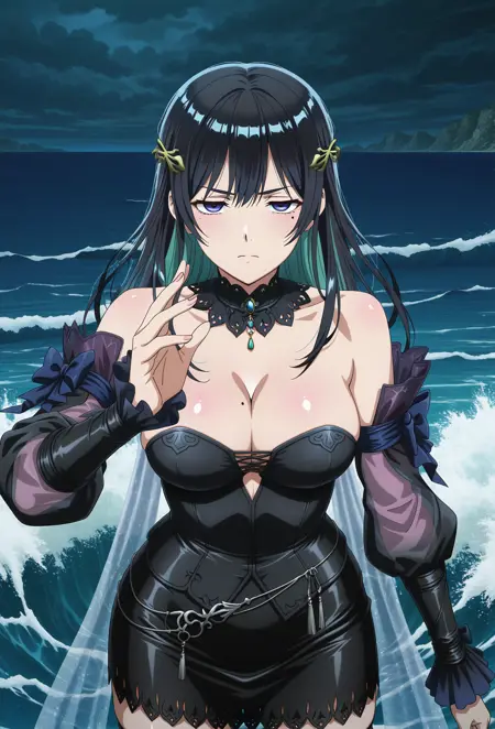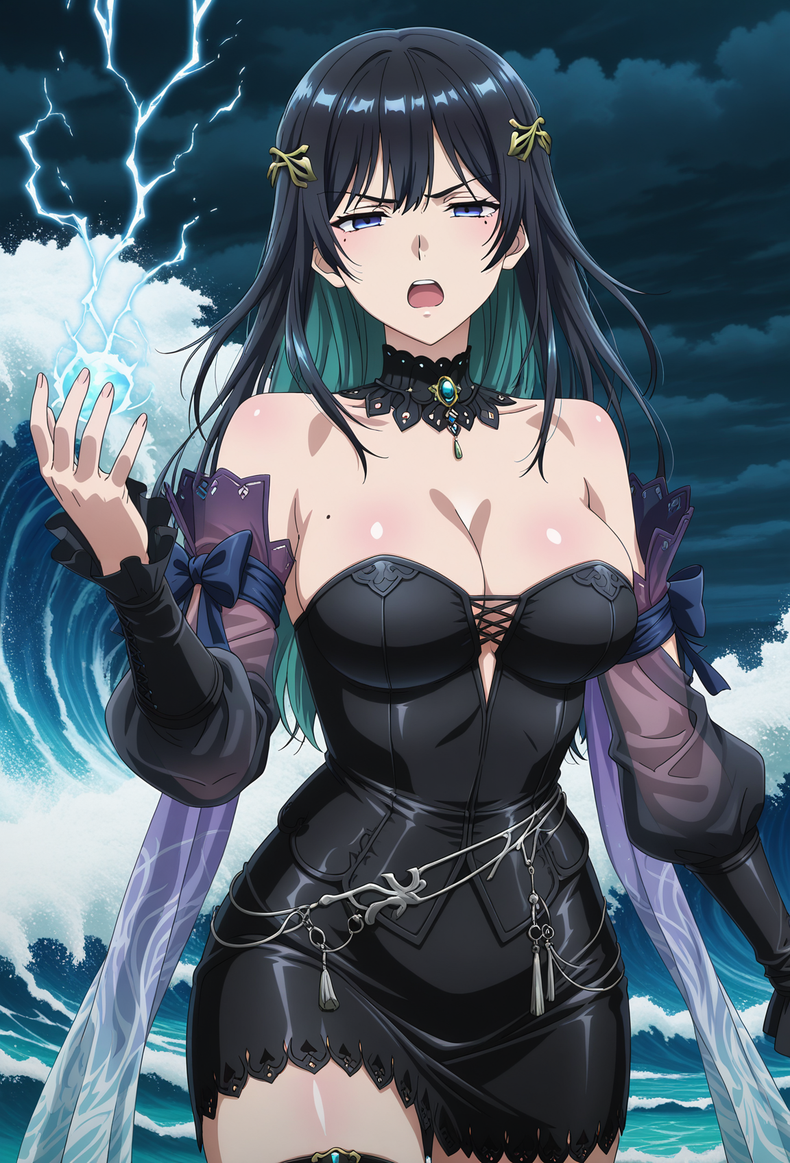 leviathan_(granado_espada), 1girl, solo, 검은 머리, 긴 머리, 머리 장식, 분리된 칼라, 가슴 부분 노출, 어깨 노출, 드레스, 검은 드레스, 어깨 끈 없는 드레스, 짧은 드레스, 보석, 분리된 소매, 손을 들고, 목걸이, 점, 치마, 어깨 끈 없음, 허벅지 스트랩, 코르셋, 검은 코르셋, hyur, 다색 머리, 검은 치마, 허벅지 부츠, 하이힐, 투명한