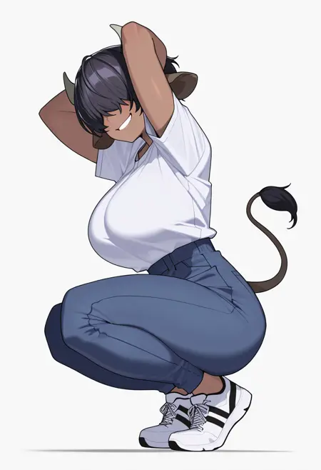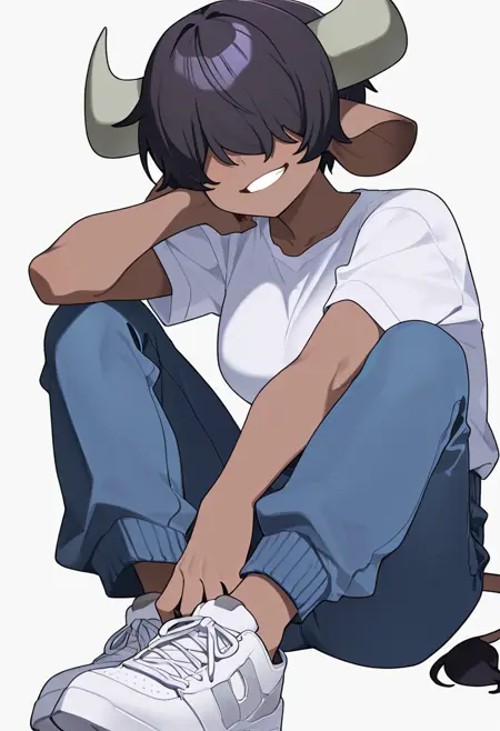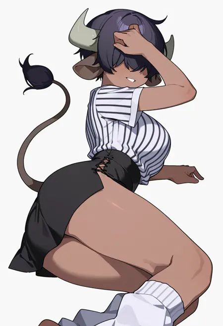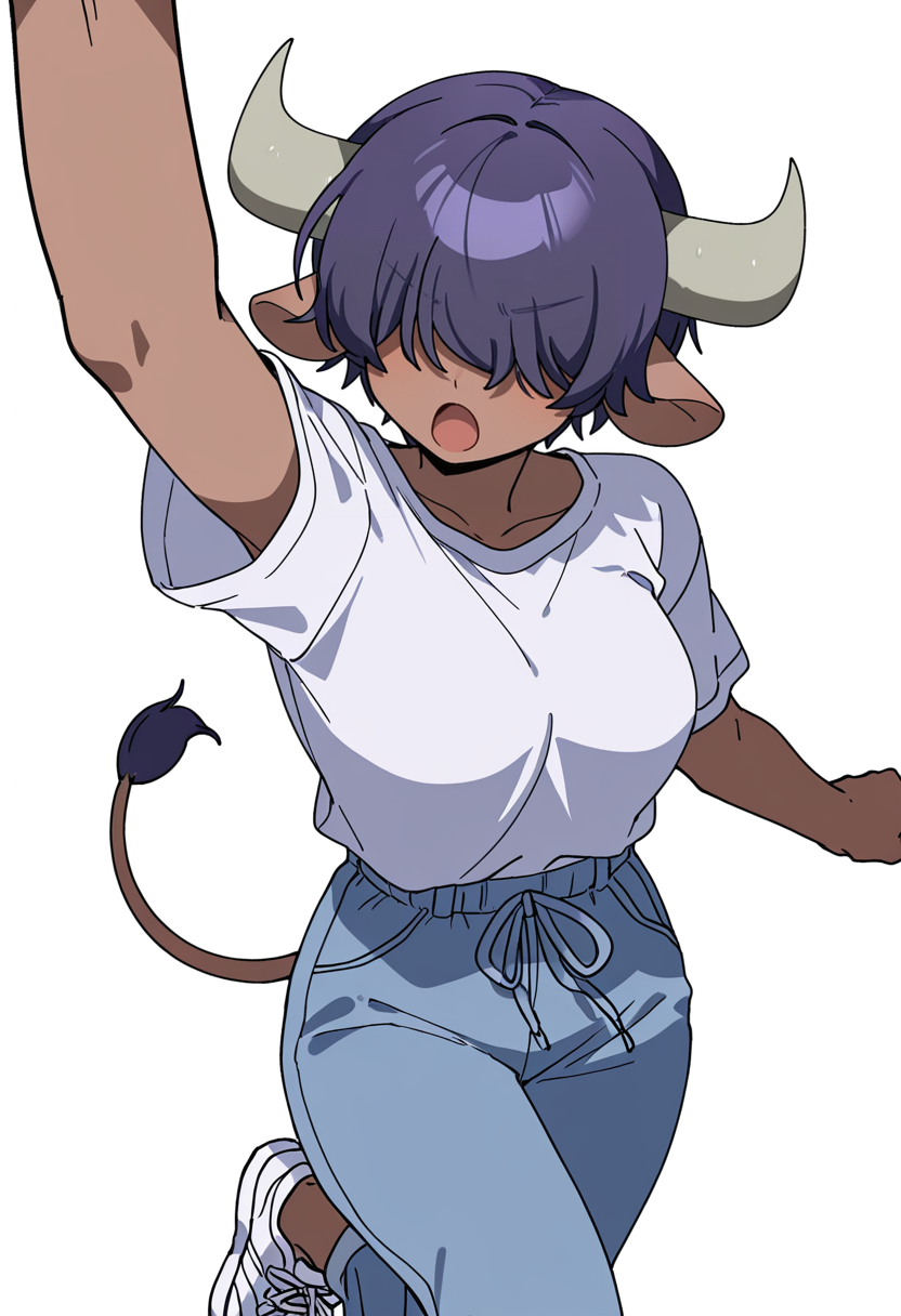bison_cnr, 1girl,cow girl, dark-skinned female, short hair, long bangs, hair over eyes, cow horns, cow ears, cow tail,