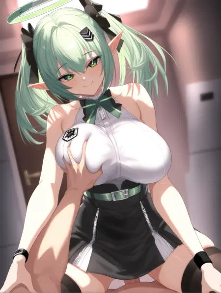 IL_Einkk V2,1girl,尖耳,光环,机械光环,绿眼,大胸部,绿发,双马尾,发饰,长发,发带,丝带,黑色丝带,绿色丝带,刘海