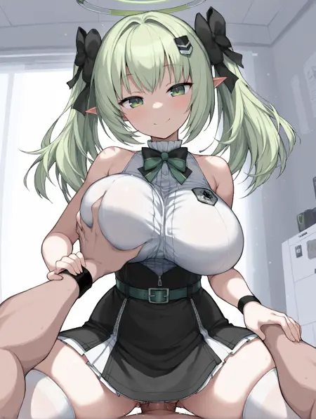 IL_Einkk,1girl,单独,绿眼,尖耳,胸部,绿发,双马尾,大胸部,发饰,长发,蝴蝶结,发带,丝带,黑色丝带,刘海,绿色丝带