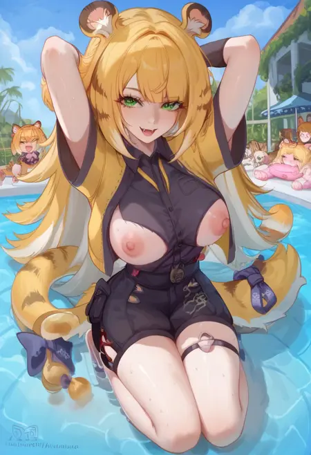 (ZZZ_Fufu, 긴 머리, 금발, 앞머리, 녹색 눈, 호랑이 귀, 호랑이 꼬리, 호랑이 소녀, 꼬리 장신구, 손가락 없는 장갑, 셔츠, 반바지, 재킷, 송곳니),