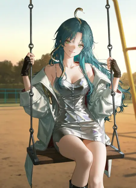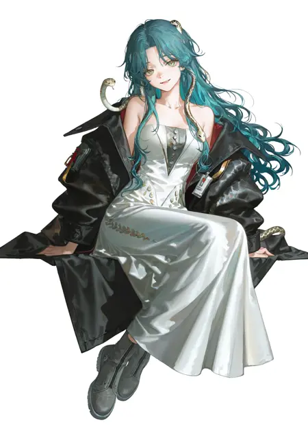 hissabeth1, 1girl, solo, aqua hair, long hair, wavy hair, parted bangs, green eyes, slit pupils, fang, fang out, bare shoulders, silver dress, short dress, pencil dress, sleeveless dress, spaghetti strap, white jacket, fingerless gloves, boots, snake, snake on head