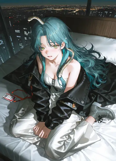 hissabeth2, 1girl, solo, aqua hair, long hair, wavy hair, parted bangs, green eyes, slit pupils, fang, bare shoulders, white dress, long dress, strapless dress, sleeveless, black jacket, open jacket, grey boots, snake, snake on head, id card