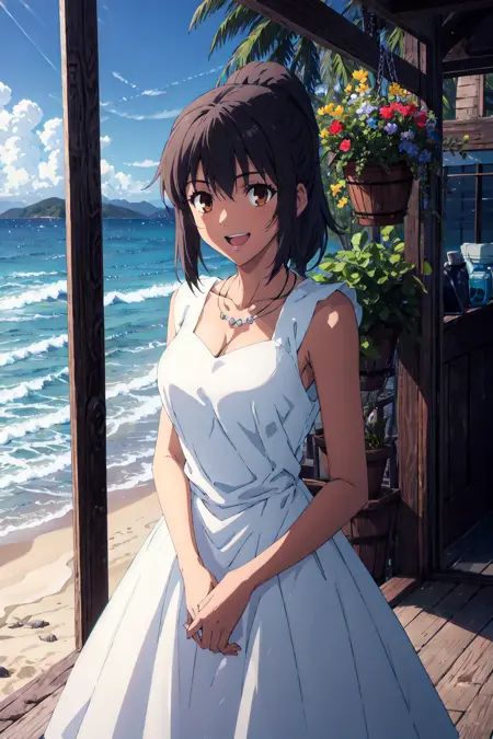 fateshirley, brown hair, short ponytail, brown eyes, white dress, sleeveless, cleavage, necklace, dark skin