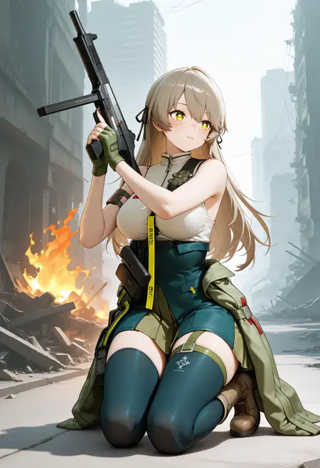 | 训练词汇 | ump40\(gfl\), star-shaped_pupils, black hair ribbon, suit1, submachine gun, fingerless gloves, skirt, asymmetrical legwear, sleeveless, jacket around waist, brown boots, green gloves, shirt, strap between breasts, green thighhighs,已复制! ump40\(gfl\), star-shaped_pupils, black hair ribbon, suit2, yellow armband, pantyhose, h&k ump, id card, green jacket, armband, single knee pad, walkie-talkie, ribbon, boots, black suit, zipper,已复制! |