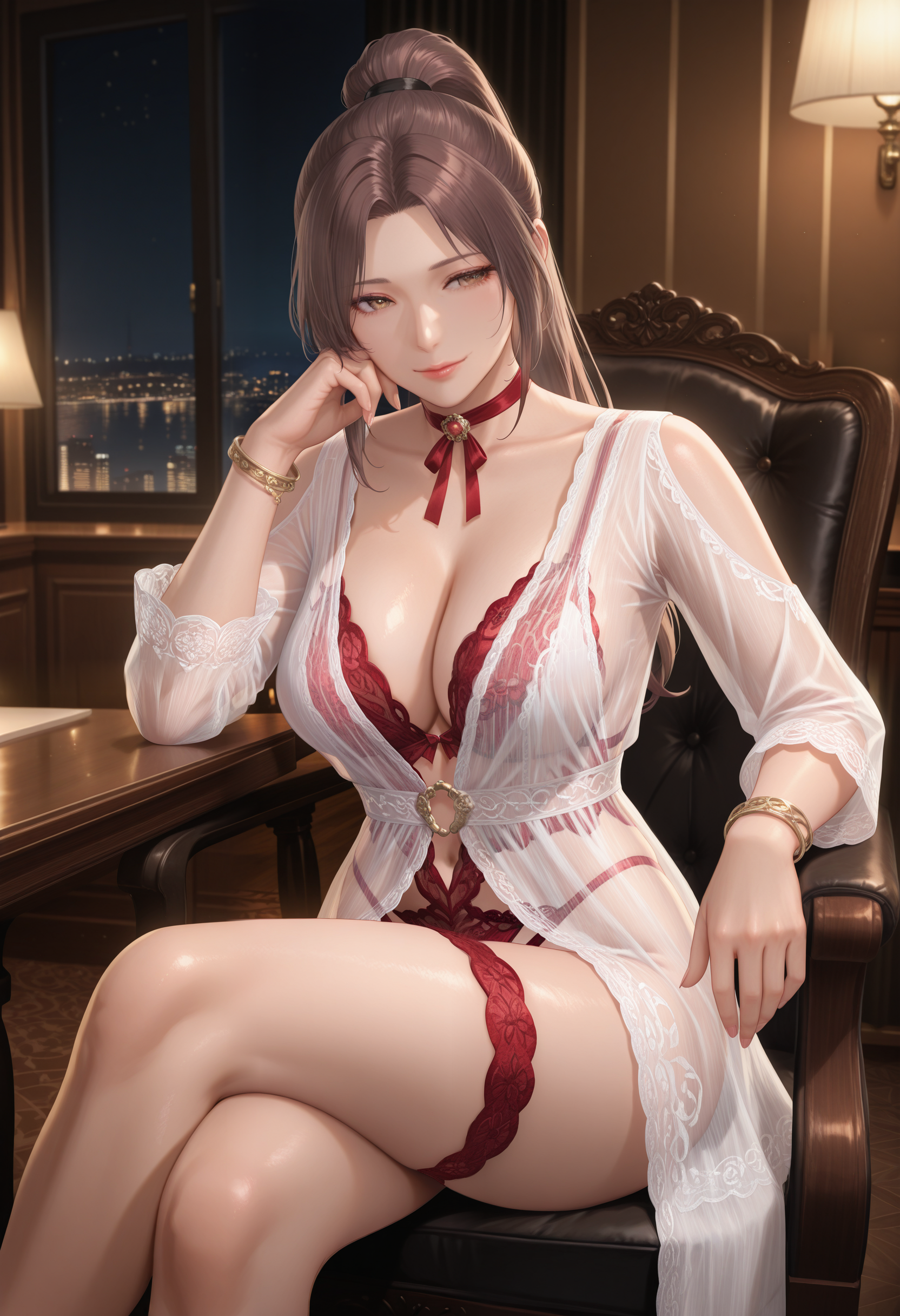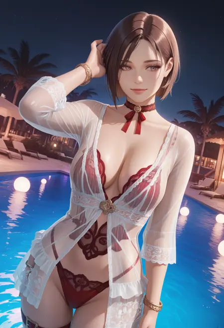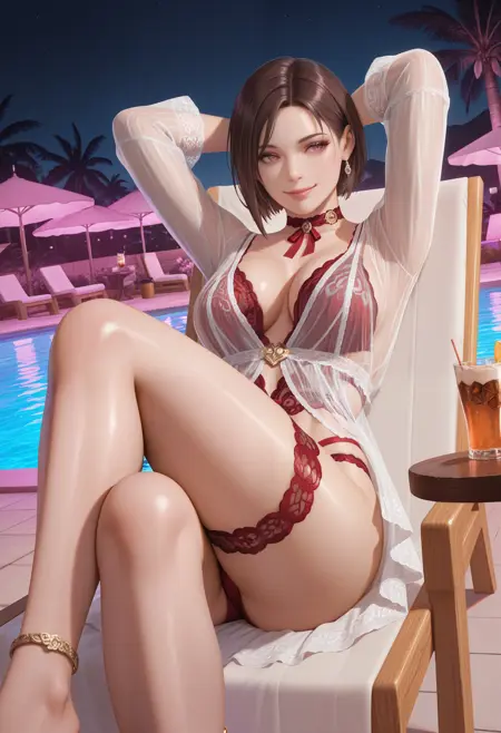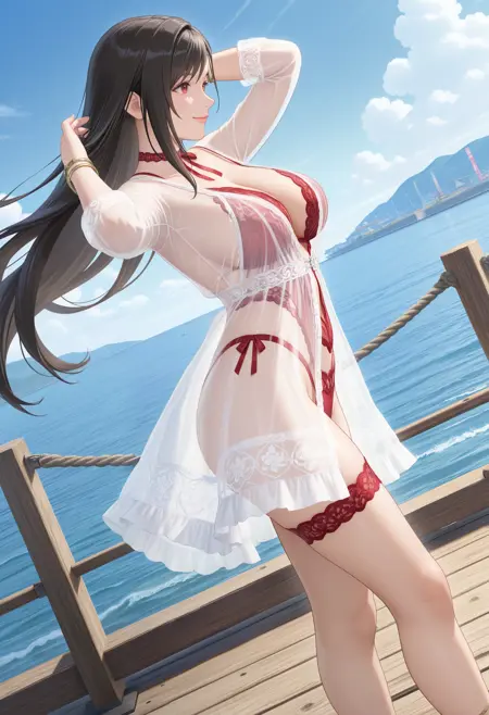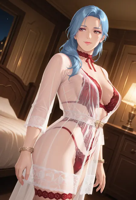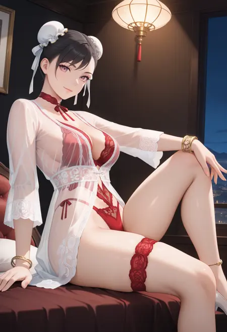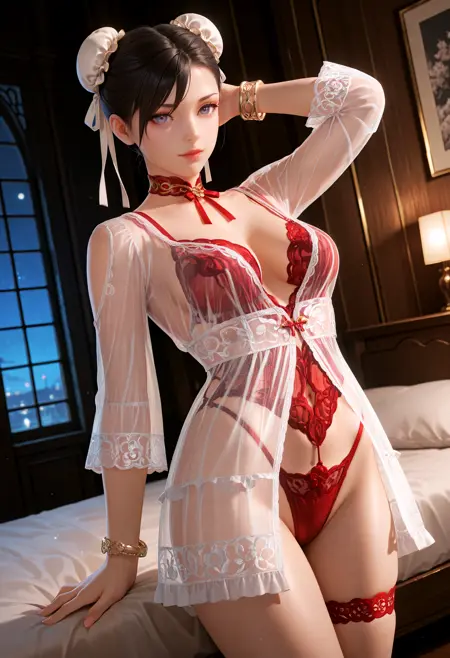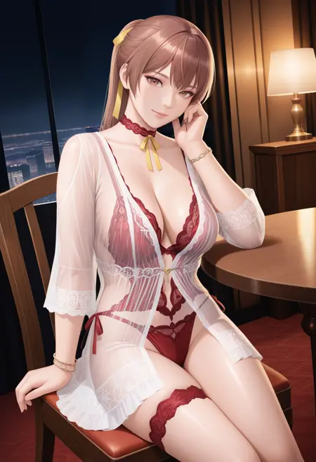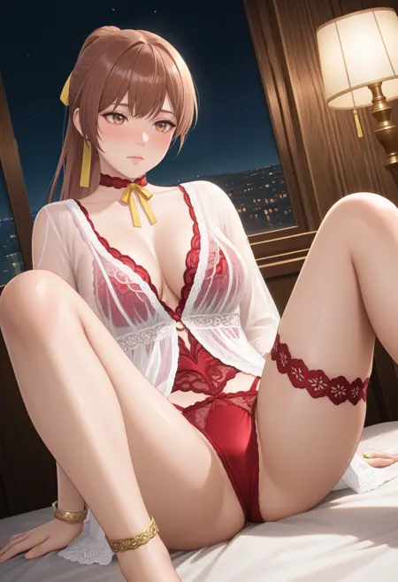 기본 프롬프트: "Rotwein_doaxvv,choker,neck ribbon,white dress,sleeves,see-through,red lingerie,underwear,bracelet,lace,red panties,highleg,thigh strap,anklet".