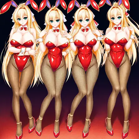 빨간 토끼 복장, 가짜 토끼 귀, 빨간 레오파드, 분리형 칼라, 빨간 넥타이, 가슴선, 손목 밴드, 피쉬넷 양말, 빨간 하이힐,