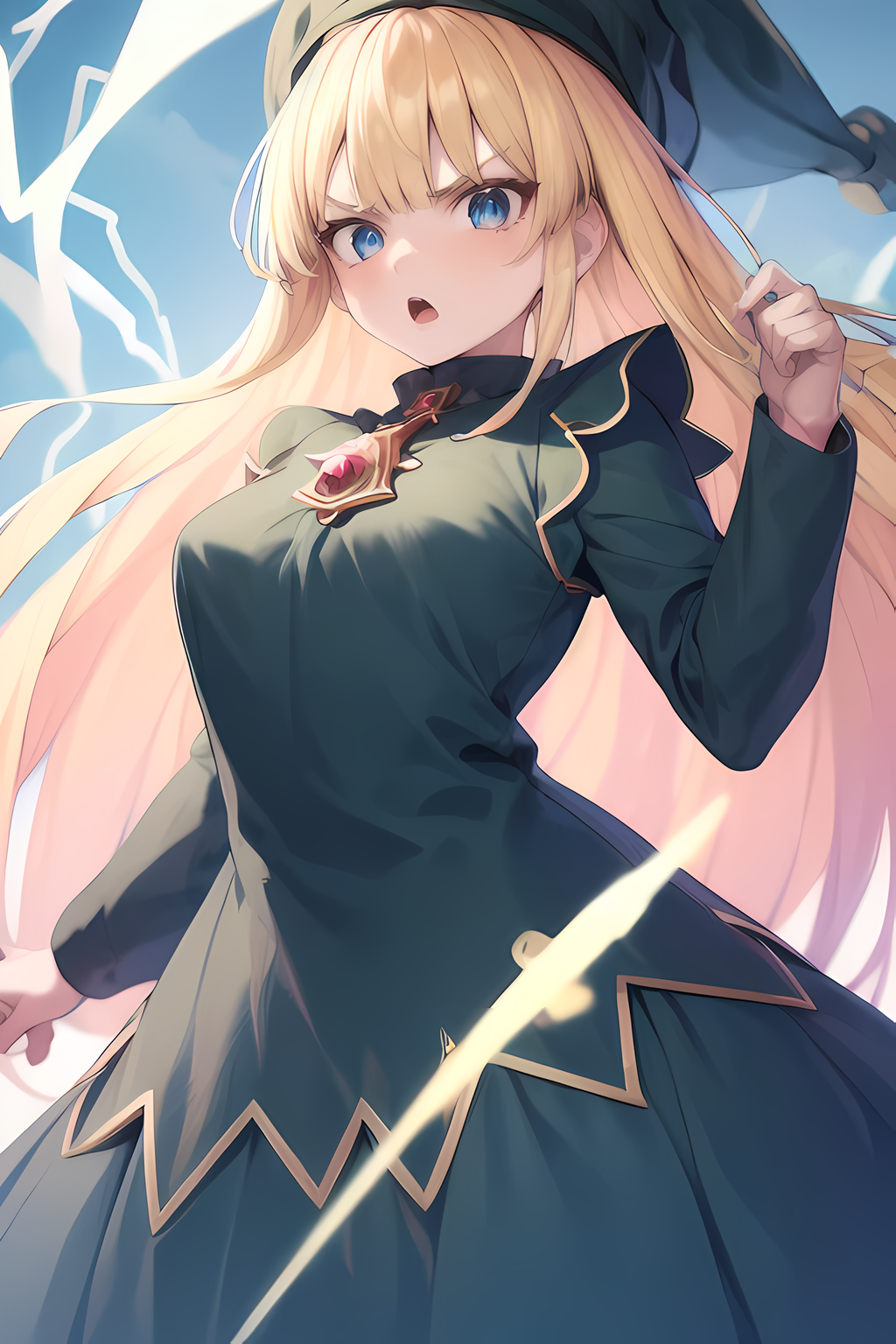 Recommended Prompts: 1girl,blonde hair, long hair, blue eyes,blunt bangs,brooch,green dress,green headwear,long sleeves,long skirt,cross-laced footwear, light green sash