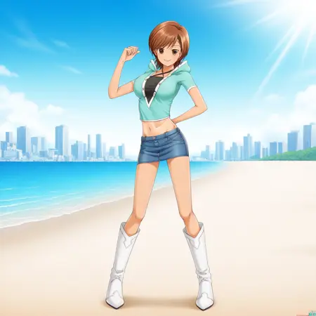 カジュアル衣装:(逸茂げんき、THE ギャル麻雀、T-GAL-M、T-GAL-M_逸茂げんき、茶色の目、茶色の髪、短髪、日焼け、日焼け跡、大きい胸、へそ、カットソー、Vネックシャツ、ターコイズシャツ、スカート、お腹、ブーツ、ミニスカート、デニム、ペンシルスカート、デニムスカート、膝上ブーツ、白いブーツ)