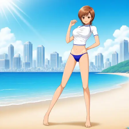 수영복: (겐키 이츠모, THE 갈 마작, T-GAL-M, T-GAL-M_겐키 이츠모, 갈색 눈, 갈색 머리, 단발, 황갈색 피부, 태닝 라인, 큰 가슴, 배꼽, 수영복, 비키니, 셔츠, 흰색 반소매 셔츠, 네크라인, 크롭 탑, 허리, 팽팽한 셔츠, 푸른 테두리, 푸른 비키니 하의, 비키니 하의)