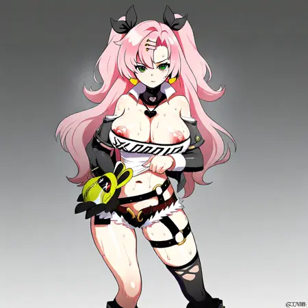 (ZZZ_니콜, 긴 머리, 분홍색 머리, 양 옆 위로 올린 머리, 헤어클립, 리본, 머리 장신구, 녹색 눈, 튜브 탑, 스트랩리스, 반바지, 컷아웃, 한쪽 허벅지 긴 양말, 부츠, 배꼽, 가슴 선)
