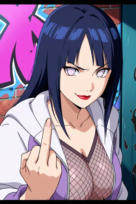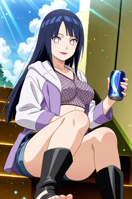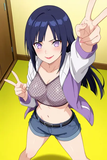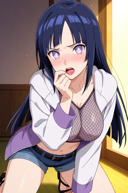 **Tags:**RTN_Hinata,long hair,dark blue hair,bangs,light eyes,red lips,fishnet top,purple and white jacket,open jacket,black belt,denim shorts,toeless boots