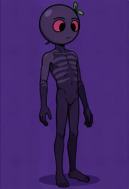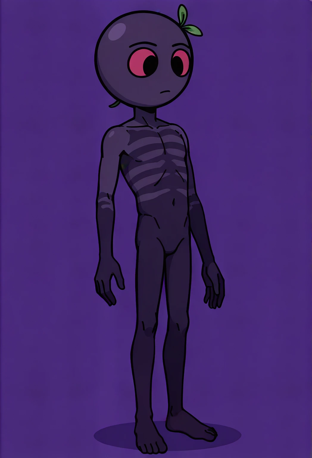 AlfonsoFRFNF, 1boy, black eyes, magenta sclera, dark purple skin, rounded head, bald, slender build, small green sprout grows from the top of head