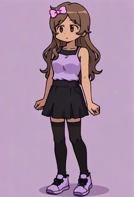 VeronicaFRNF, 1girl, tan skin, long brown hair, pink head bow, lavender sleeveless top, black undershirt, black skirt, black stockings, purple-black sneakers, brown eyes, no sclera