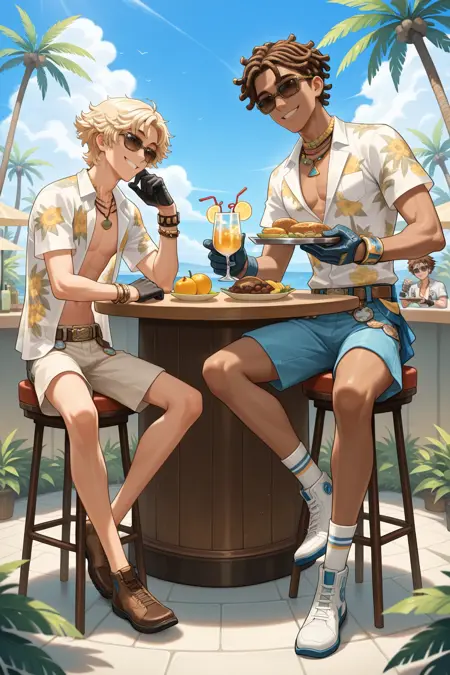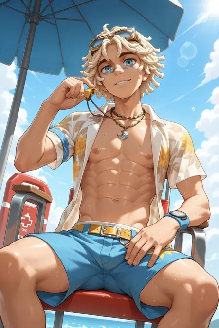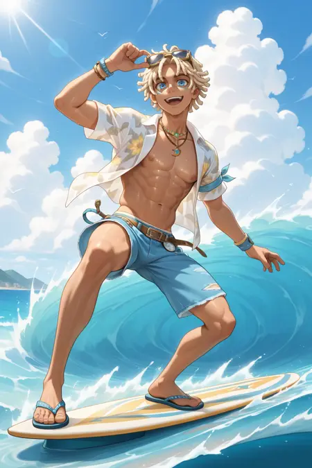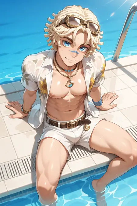 norton campbell, blonde hair,blue eyes, goggles on head,sunglasses,necklace,dreadlocks,open shirt,blue shorts