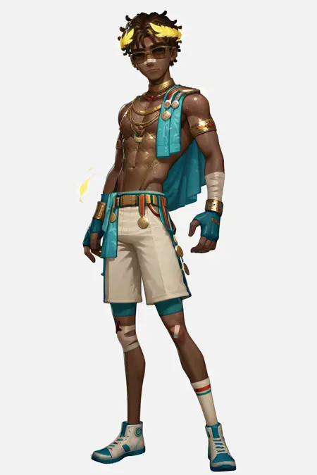 GanjiGupta,brown hair, dark skin,dark-skinned male,dreadlocks ,bandaid on nose,laurel crown,sunglasses,official alternate costume,armlet