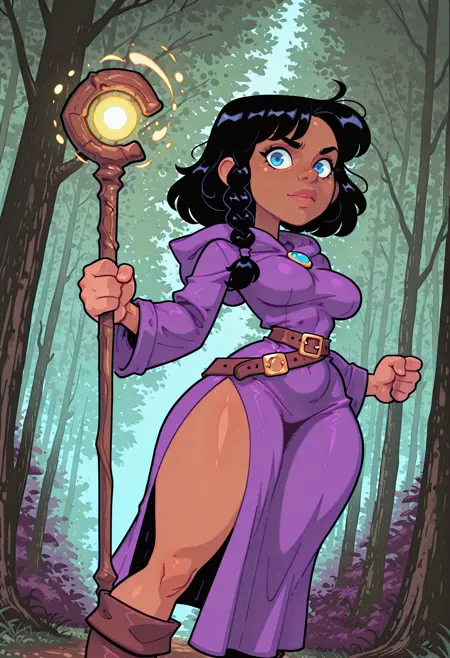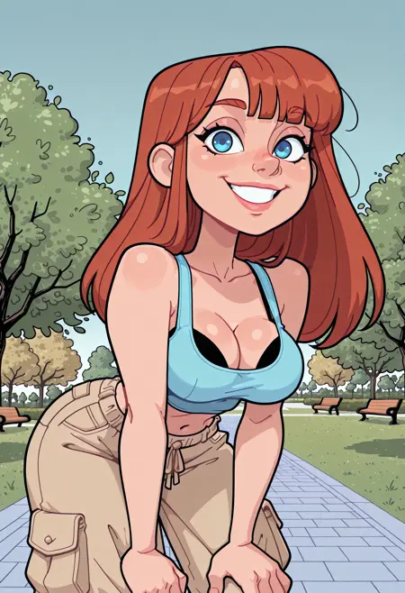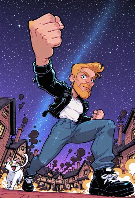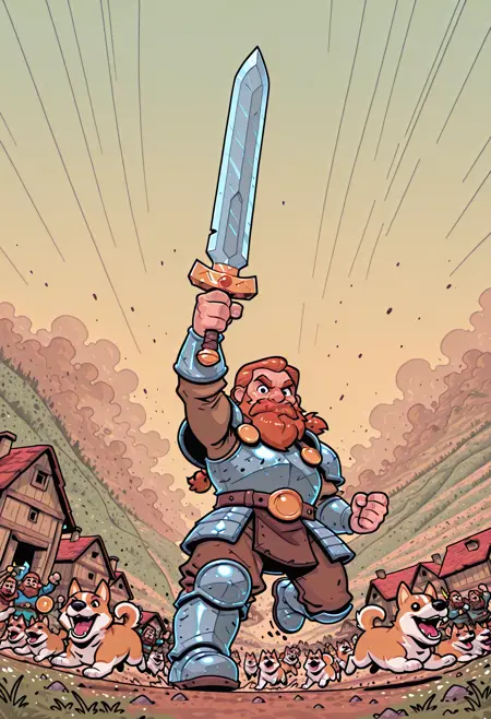 A western cartoony style with bold lines and bright colors.