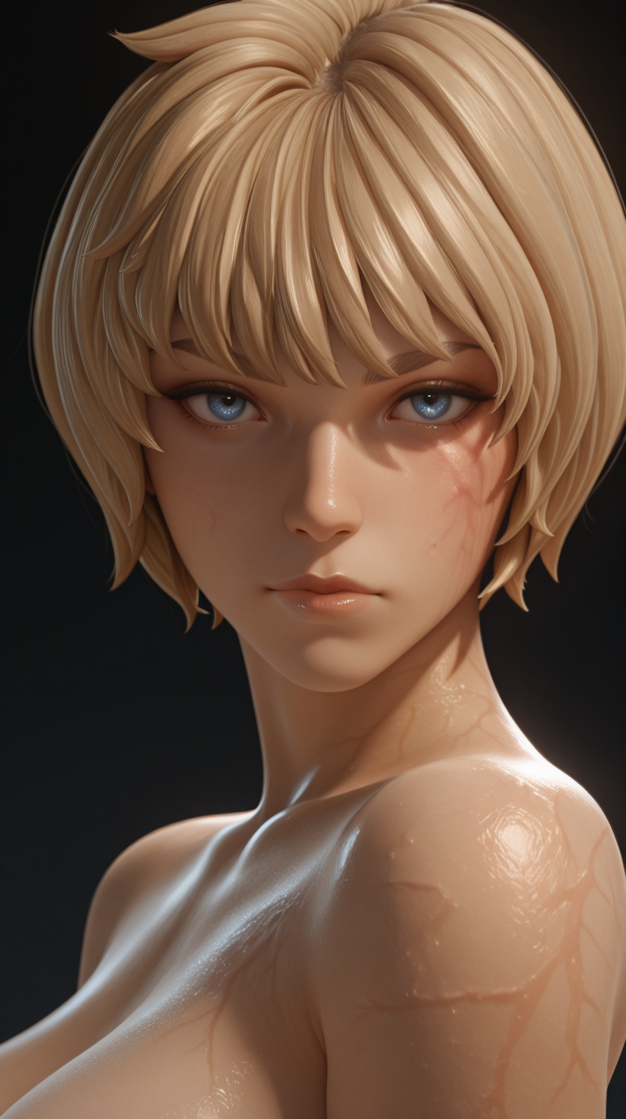 見た目のタグ:傷、頬の傷、火傷の跡、前髪、短い髪、金髪、青い目