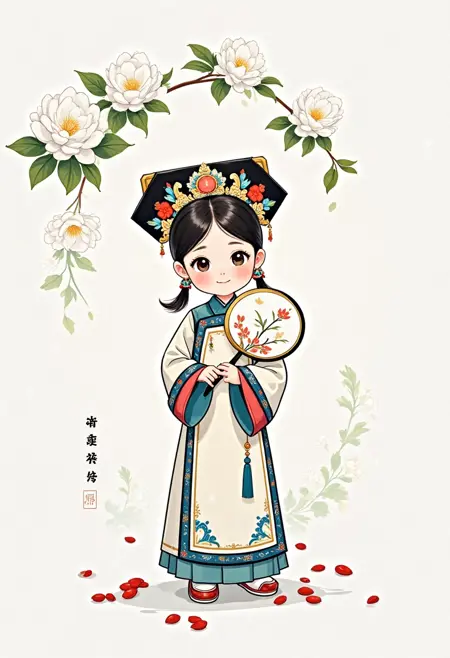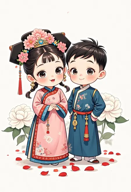 マンchuスタイルのキャラクターを描く、マンchu衣装を着たかわいらしい子供たち、花飾りの頭飾りを着け、扇子を持っている、背景には白い牡丹と赤い花びら。