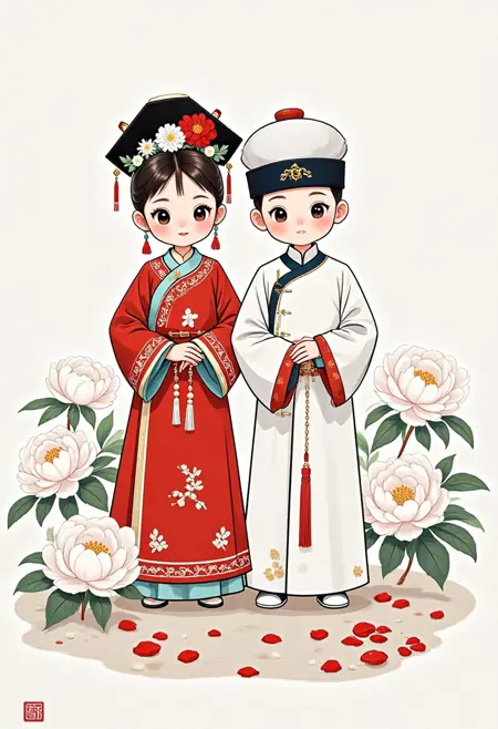 マンchuスタイルのキャラクターを描く、マンchuのカップルのような存在、女の子は赤、男の子は白、白い牡丹と赤い花びらの傍で立っている。