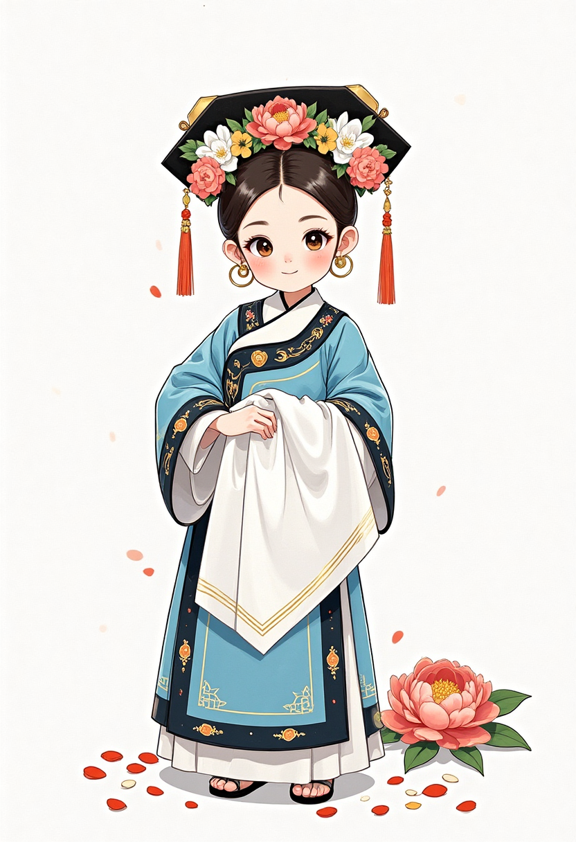 マンchuスタイルのキャラクターを描く、青い袴を着たマンchuの女の子、花びらが豊かな頭飾りを着け、白い布を持ち、牡丹と花びらで囲まれている。