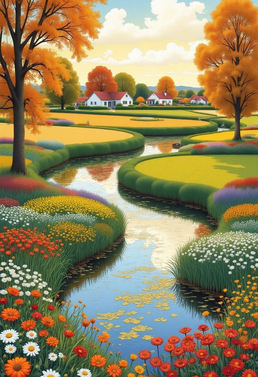 6. 色彩鲜艳的乡村景观,包含河流与花朵,秋日正午,蜿蜒的河流,秋色花朵,农舍,温暖的色调,温馨的感觉,丰收的韵味。