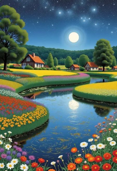 9. 色彩鲜艳的乡村景观,包含河流与花朵,繁星点点的夜晚,寂静的河流,月光下的花朵,隐秘的小屋,明暗对比,神秘的氛围,夜色之美。
