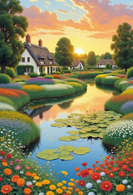 5. 色彩鲜艳的乡村景观,包含河流与花朵,夏日黄昏,慵懒的河流,野花,茅草屋顶的农舍,丰富的色彩,放松的氛围,乡村的魅力。
