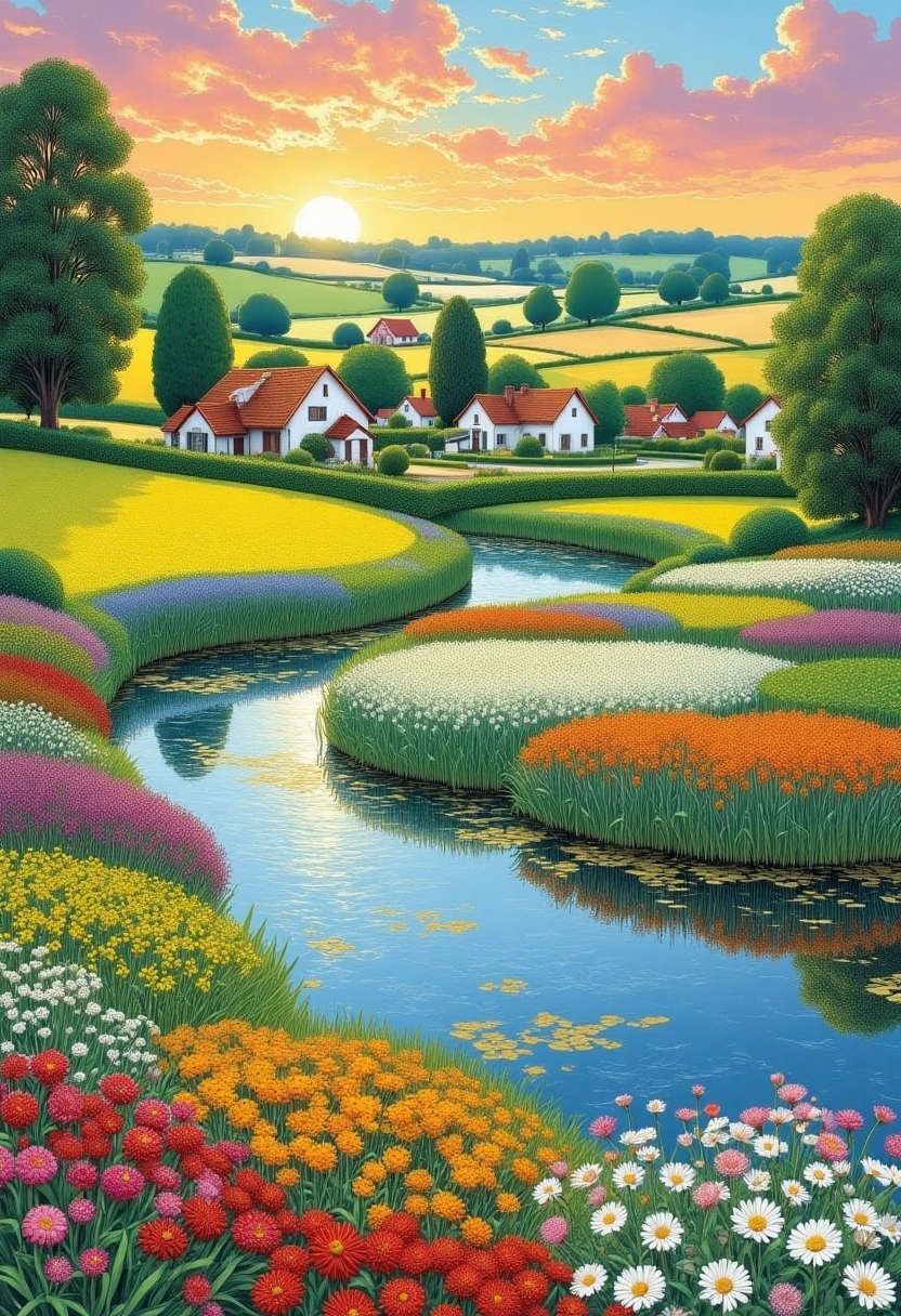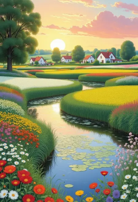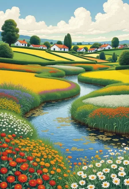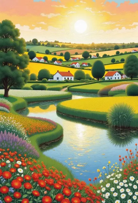 基础提示词: 色彩鲜艳的乡村景观,包含河流与花朵