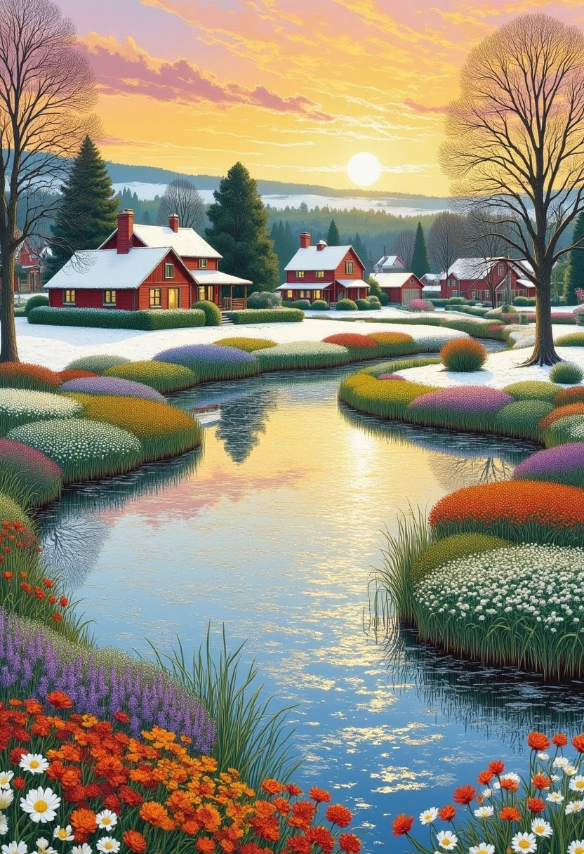 7. 色彩鲜艳的乡村景观,包含河流与花朵,冬日黄昏,结冰的河流,耐寒的花朵,覆雪的房屋,冷色调,平静的情绪,冬日田园风光。